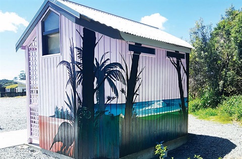 Parua Bay Community Centre public toilet block mural Thanks to Whangārei artist Earnest Bradley, the Parua Bay Community Centre public toilet – formerly of Matapōuri Beach – has rolled into its new home as a colourful crowd‑pleaser beside the skatepark.