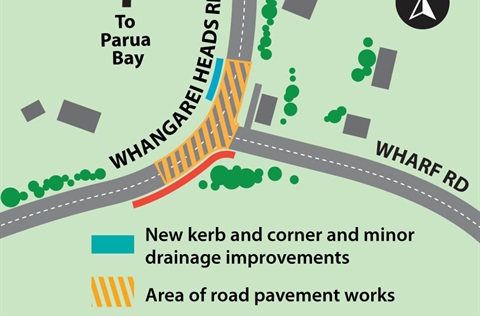 Whangarei Heads and Wharf roads intersection safety improvements We’re improving safety at the bend where Whangarei Heads Road meets Wharf Road in Parua Bay.